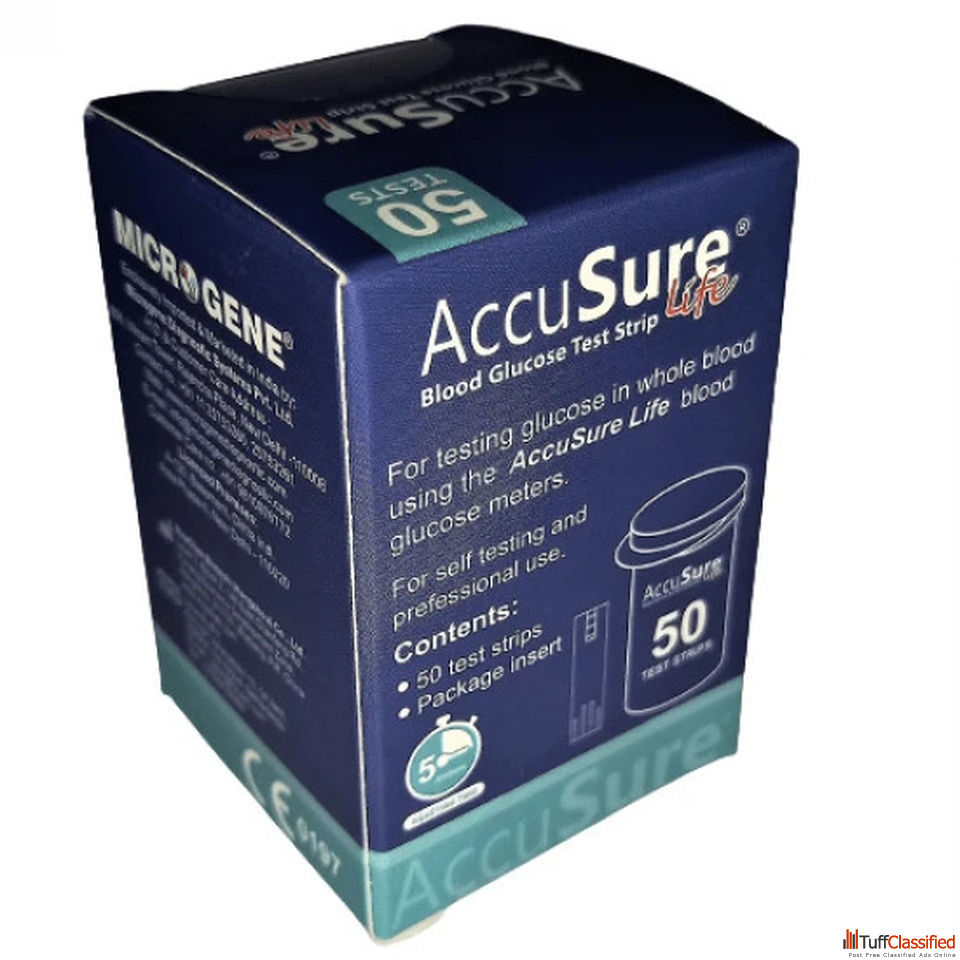 AccuSure Life Test Strips (50 Strips) offer reliable and accurate blood glucose monitoring for daily diabetes management. Designed for quick results and easy handling, these strips ensure consistent performance with compatible glucometers. Ideal for home use, they help you stay on track with your health through convenient and precise testing anytime.