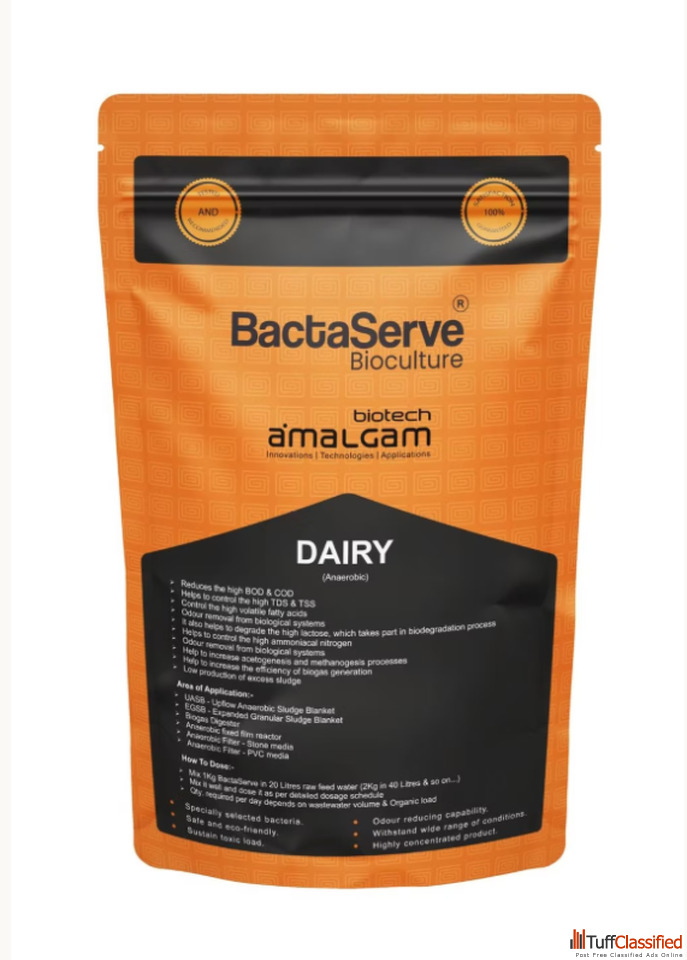 BactaServe Dairy is a specialized microbial bioculture designed to treat wastewater generated by the dairy and milk processing industries. It contains selected microorganisms that help break down fats, oils, grease, proteins, and lactose commonly found in dairy effluent. The formulation supports effective reductions in BOD and COD, improves the digestion of organic waste, and helps stabilize biological treatment systems. It is compatible with treatment technologies such as UASB, anaerobic digesters, MBBR, SBR, and activated sludge processes. By enhancing microbial activity, BactaServe Dairy helps reduce odour, foam formation, and excess sludge while improving overall wastewater treatment efficiency.