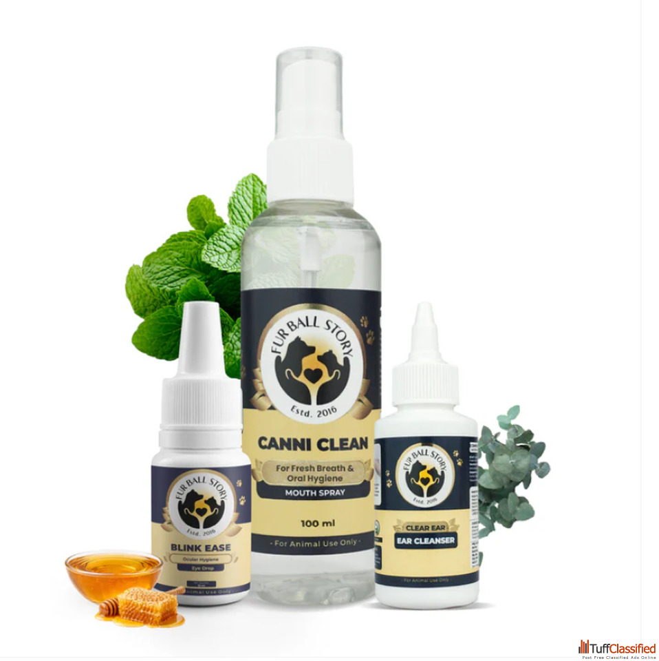 Introducing the Fur Ball Story Hygiene Essentials. Our trio of Canni Clean, Blink Ease, and Clear Ear is designed to keep your fur baby fresh, focused, and feeling their best. Made with love and natural ingredients like mint and eucalyptus, our formulas are gentle enough for daily use but tough on dirt and odors.