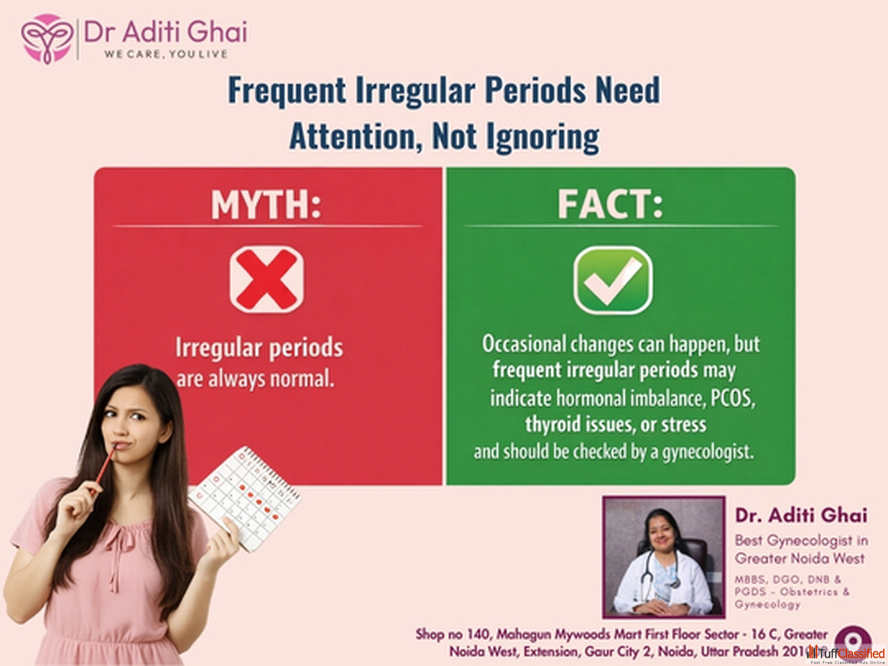 Irregular periods should not be ignored—early care makes a difference. Consult Dr Aditi Ghai, a trusted Best gynecologist in Greater Noida, for accura...
