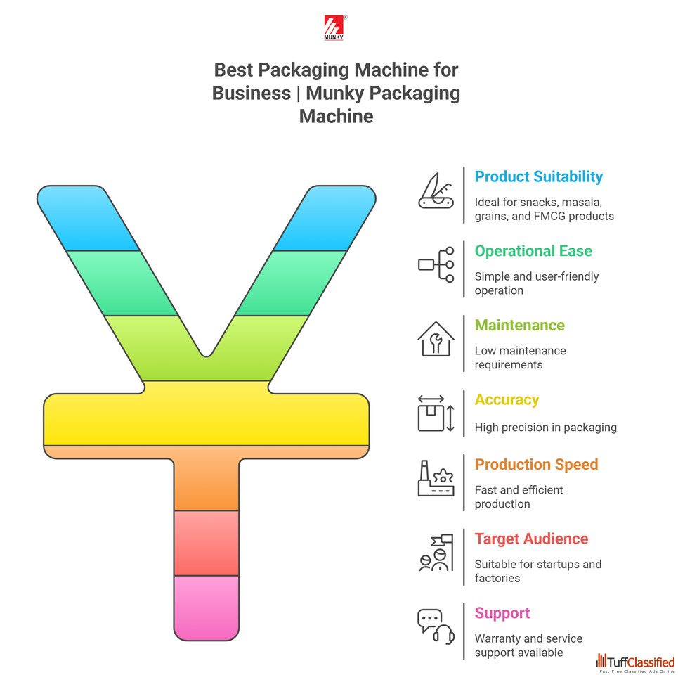Start Your Business with the Best Packaging Machine from Munky Packaging Machine. Suitable for Snacks, Masala, Grains, Pulses & Other Fmcg Products. Easy Operation, Low Maintenance, High Accuracy & Fast Production. Perfect for Startups & Factories. Available in Different Models with Warranty & Service Support. Contact Now for Price & Demo.