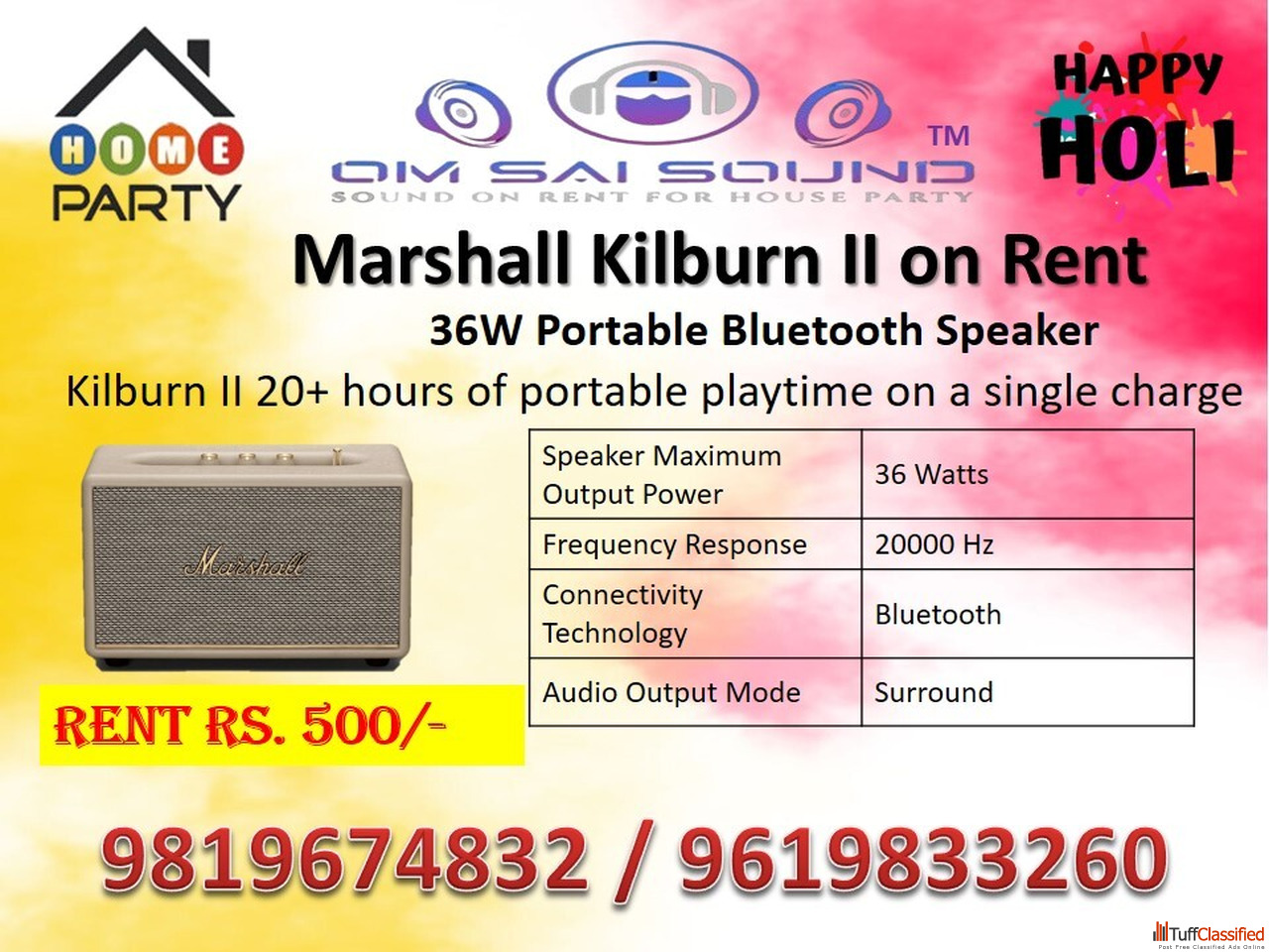 Make your Holi 2026 celebration louder with the Marshall Tufton sound system on rent at just ₹1000. Powerful output, deep bass, and portable design—id...