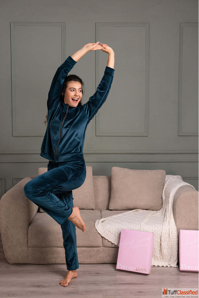 Shop Blue Velvet Stripe Track Suit for women online at Private Lives. Designed with plush velvet fabric, a comfortable fit, and modern stripes, this winter tracksuit blends warmth, style, and everyday comfort for lounging, travel, and relaxed outings.