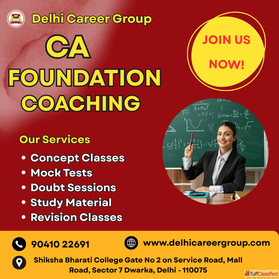 Delhi Career Group provides the best CA Foundation Coaching in Dwarka Delhi with a proven record of student success. The institute offers expert faculty, updated ICAI-based study material, and interactive doubt sessions to build a strong foundation in all subjects — Accounts, Law, Mathematics, and Economics. Regular mock tests and performance reviews help students track progress and improve accuracy.