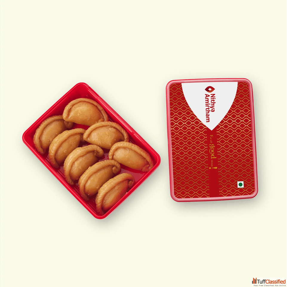 Experience the richness of Authentic Chandrakala, a crispy, golden delight filled with luscious kova and soaked in fragrant saffron and cardamom syrup. Crafted with care, this indulgent treat from Nithya Amirtham traditional sweets brings festive joy to every bite. Enjoy authentic sweets made fresh and perfect for gifting or ordering sweets online.