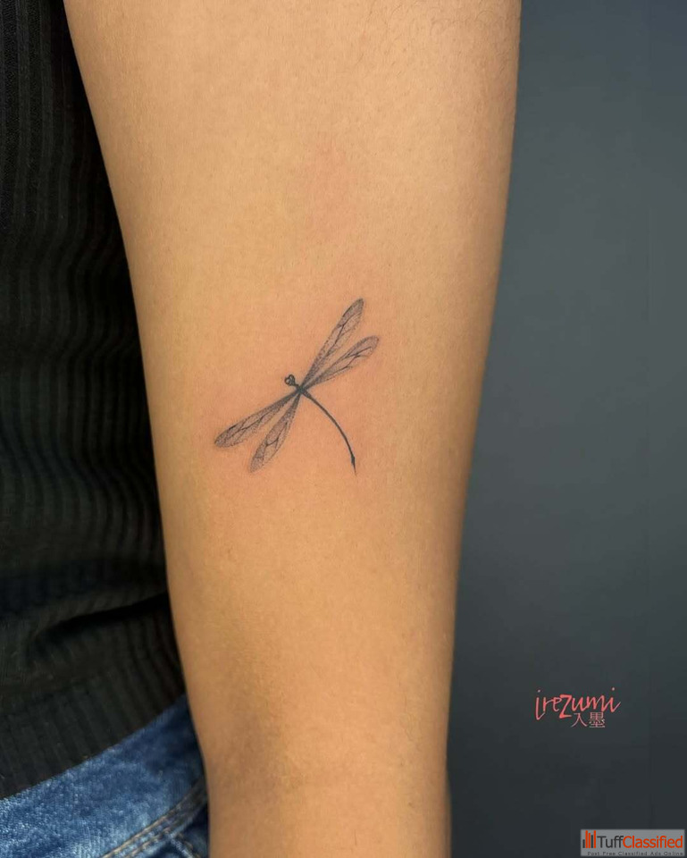A delicate dragonfly tattoo crafted in fine-line detail symbolizing transformation, resilience, and grace. This minimalist masterpiece captures the essence of balance and change, celebrating strength in subtlety and beauty in evolution.