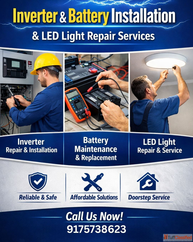 We provide reliable and professional electrical repairing services for homes and small businesses. Our services include inverter installation, inverter repairing, battery maintenance, battery replacement, and LED light repairing. We ensure safe, quick, and affordable solutions at your doorstep.