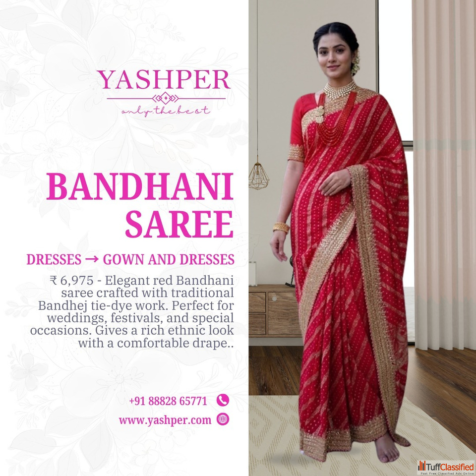 Shop premium Bandhani sarees at Yashper. This elegant red Bandhej saree features traditional tie-dye craftsmanship, perfect for weddings, festivals, and special occasions. Experience comfort, style, and rich ethnic fashion with our designer collection.