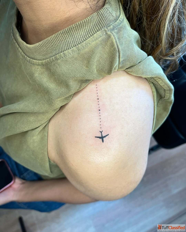 A charming airplane tattoo created in Fine Line Tattoo art style a tribute to freedom, exploration and endless horizons. Minimal and expressive, this design embodies wanderlust and the spirit of adventure. Inked at our tattoo studio in Chennai, it’s perfect for dreamers who carry the sky in their hearts and stories in their wings.