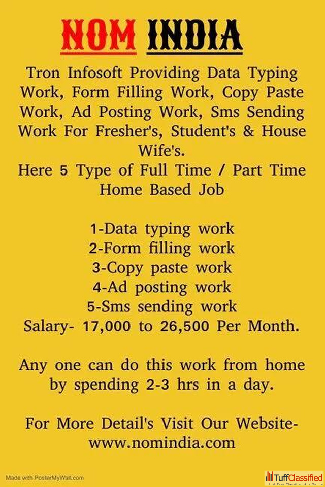 Simple Part Time Full Time Home Based Data Entry Job, Home Based Typing Jobs, Work At Home, Home Based SMS Sending Jobs, Home Based Data Entry, Data Entry Operator, Data Entry Typist For More details visit company website- www.nomindia.com