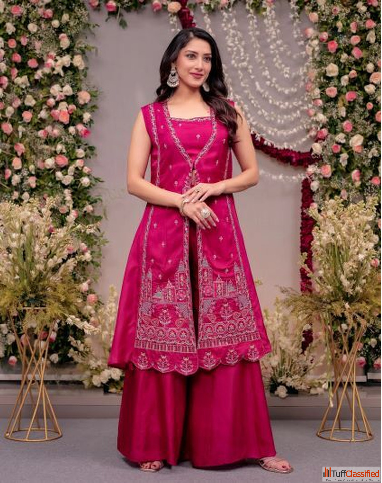 Make a striking statement in this Fuchsia Pink Indo-Western Set, designed for women who love vibrant elegance with a contemporary twist. This stunning Hot Pink Silk Fusion Outfit perfectly blends traditional craftsmanship with modern silhouettes.
