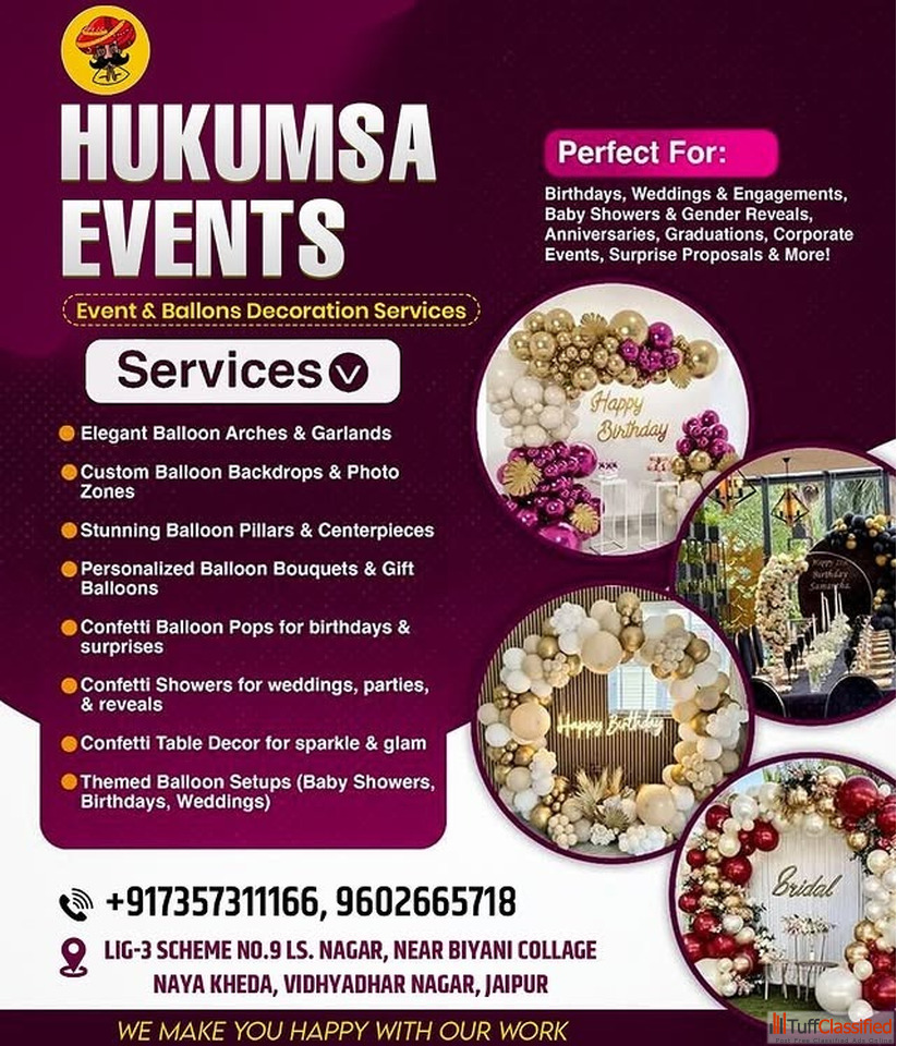 Make your child’s celebration truly special with Hukumsa Events, a trusted Balloon Decoration & Party Planner. We offer creative kids birthday party planner in Jaipur services, including kid’s birthday party decoration in Jaipur, themed setups, and balloon decorations services. From best birthday decoration in Vaishali Nagar to baby shower decorations, our birthday decoration team near me delivers joyful, colorful events with professional decoration services near me.