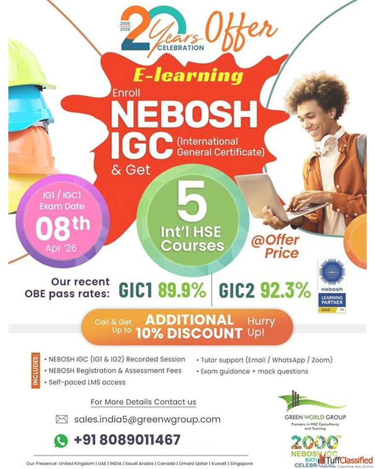 Enroll now and also gain 5 International HSE courses at a special offer price, with NEBOSH registration and assessment fees included.