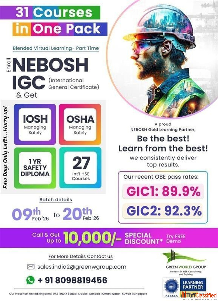 Freedom Offer – Enroll in NEBOSH IGC & Unlock the 20-in-1 Mega Pack Get FREE IOSH MS, OSHA 30hrs, Train the Trainer (UK), IMS & 15 Int’l HSE C...