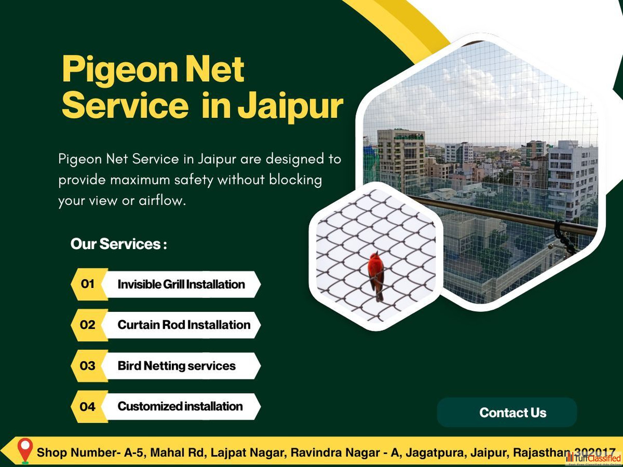 Agar aap apni balcony ya flat me pigeon problem se pareshaan ho, to Pigeon Net Service in Jaipur aapke liye perfect solution hai. Jaipur ke flats aur ...