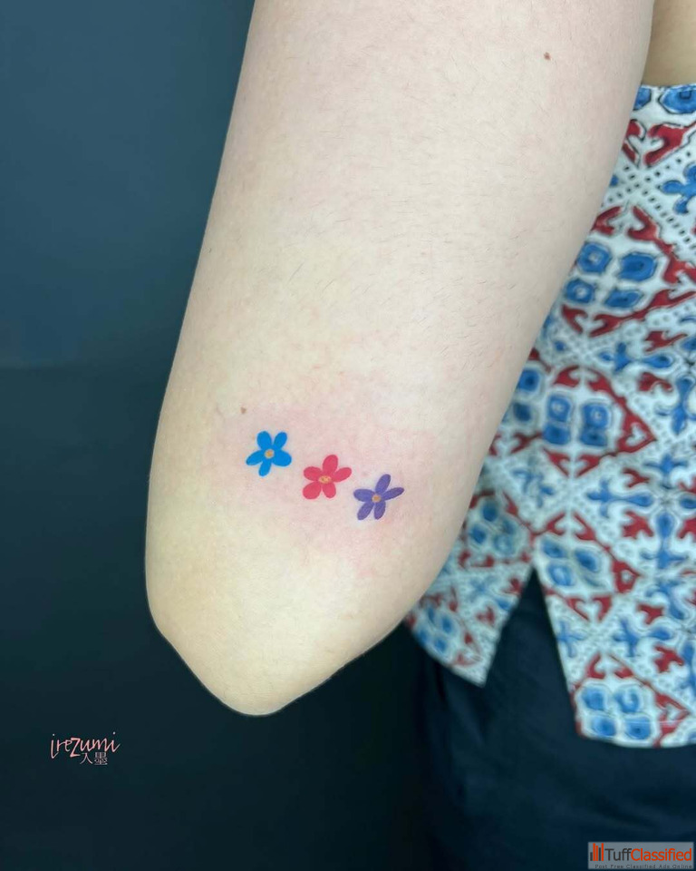 Three tiny blossoms bloom in bright playful hues, capturing joy, individuality and gentle happiness. Crafted with care by a Professional tattoo artist in Thiruvanmiyur, these colourful petals celebrate life’s lighter moments. Their airy placement adds charm, making this tattoo a soft reminder that little sparks of colour can brighten every day.