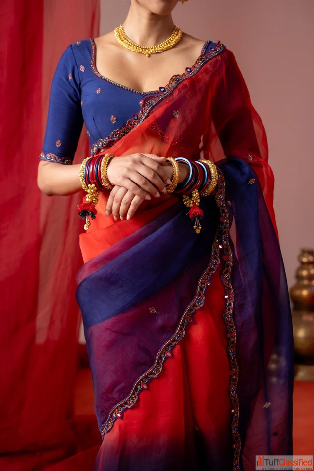 Crafted in lightweight organza, the saree features a stunning ombré transition from deep red to midnight blue with delicate hand-embroidery. The blouse piece comes in soft muslin. This ensemble fuses contemporary sophistication with festive grandeur.
