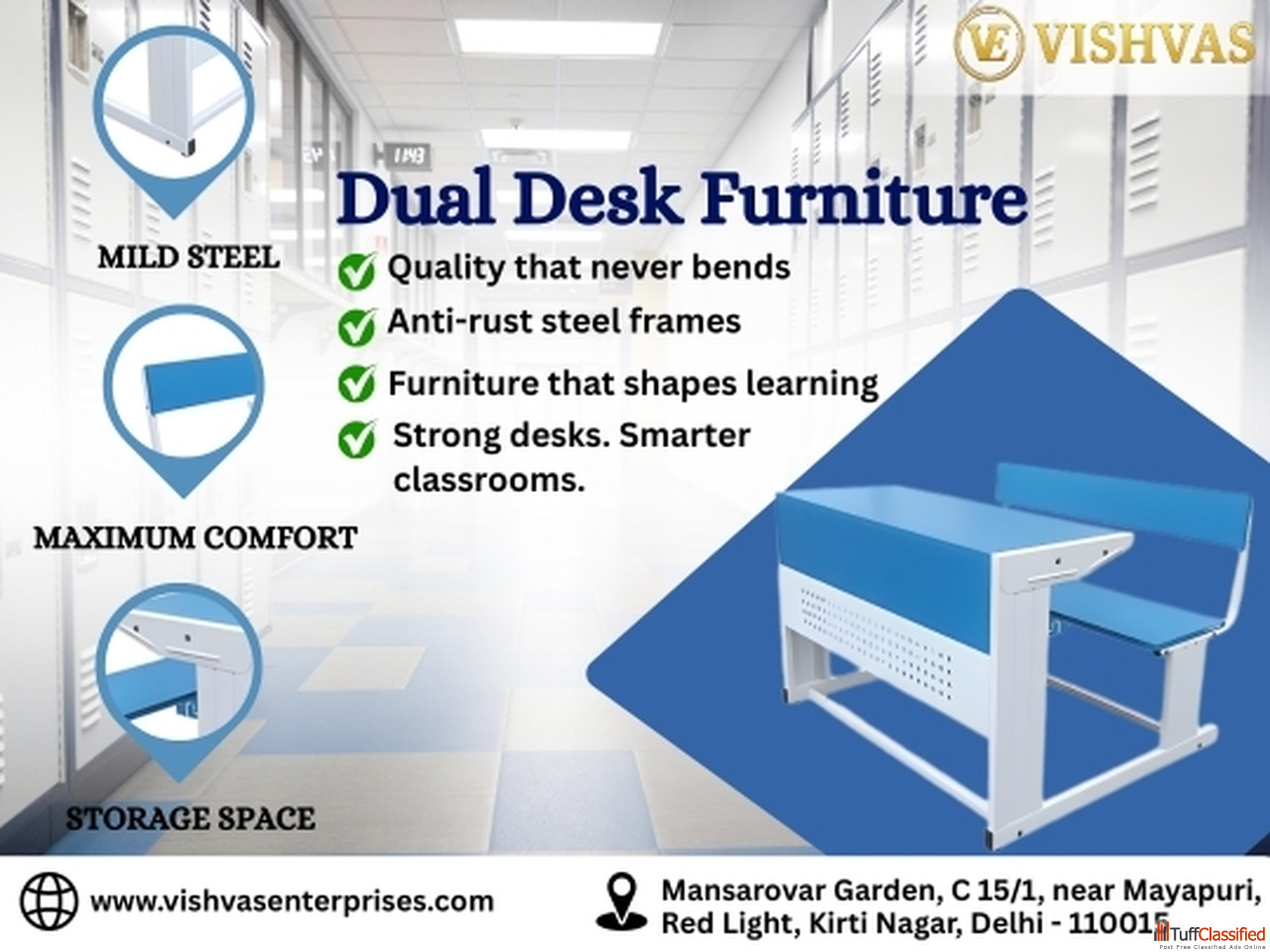 Vishvas Enterprises is a trusted school furniture manufacturer in Kirti Nagar, offering strong and comfortable dual desk furniture for classrooms. Des...