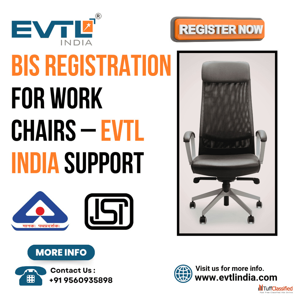 EVTL India helps manufacturers and importers get BIS registration for work chairs efficiently. Our expert team guides you through documentation, testing, and compliance with safety and quality standards. With professional support at every step, we ensure a smooth certification process, making your products market-ready quickly and confidently. Trust EVTL India to simplify BIS registration, boost product credibility, and support long-term business growth in the Indian market.