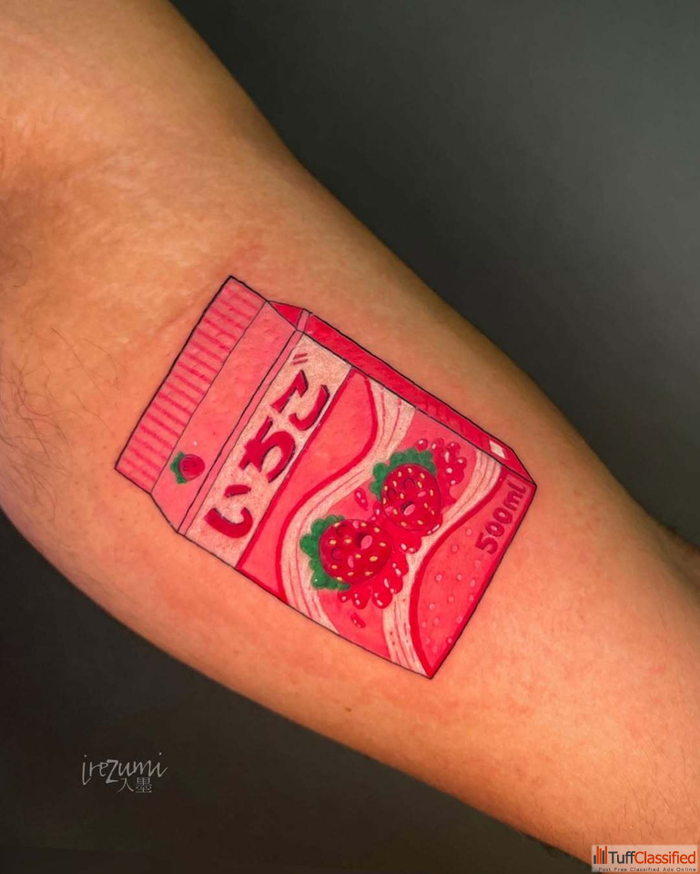 A playful Strawberry Pack Tattoo bursting with vibrant pink charm and nostalgia. Designed as a custom tattoo at our Professional tattoo studio in Chet...