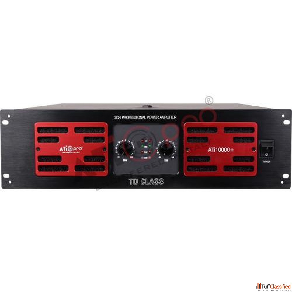 2 Channel 10000 Watt DJ Amplifier Model ATI10000+ is built to deliver extreme power and high performance sound for professional DJ setups and large scale events, it ensures strong output, deep bass, and clear audio across both channels for an immersive experience, designed with advanced circuitry and durable components, it offers stable performance and efficient heat management during long hours of operation, ideal for clubs concerts and outdoor applications, it provides consistent and distortion free sound output, manufactured under ATI Pro Technologies, this amplifier ensures reliability powerful performance and superior audio quality for demanding sound environments.