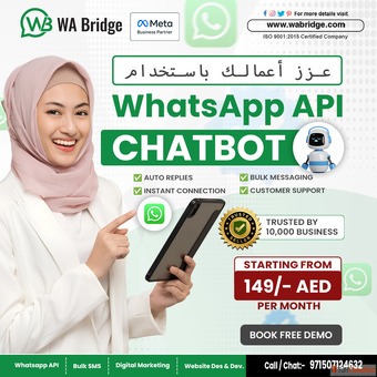 Get verified WhatsApp Business API at WABridge– Starting from just 149 AED/month! - Auto Replies - Bulk Messaging - Smart Chatbots - 24/7 Availability...