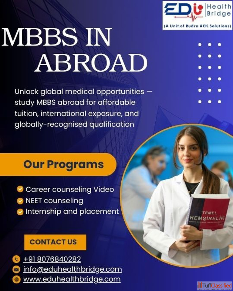 Discover the amazing benefits of studying MBBS abroad with EduHealthBridge, a trusted overseas education consultant helping students achieve their dream of becoming doctors. Explore globally recognized MBBS courses with affordable MBBS course fees and flexible MBBS course duration and fees structures in top medical universities. Get detailed guidance on the MBBS syllabus, global learning opportunities, and the best after MBBS courses for specialization. With EduHealthBridge, admission becomes simple — Just Qualify NEET and start your journey toward a successful international medical career today!
